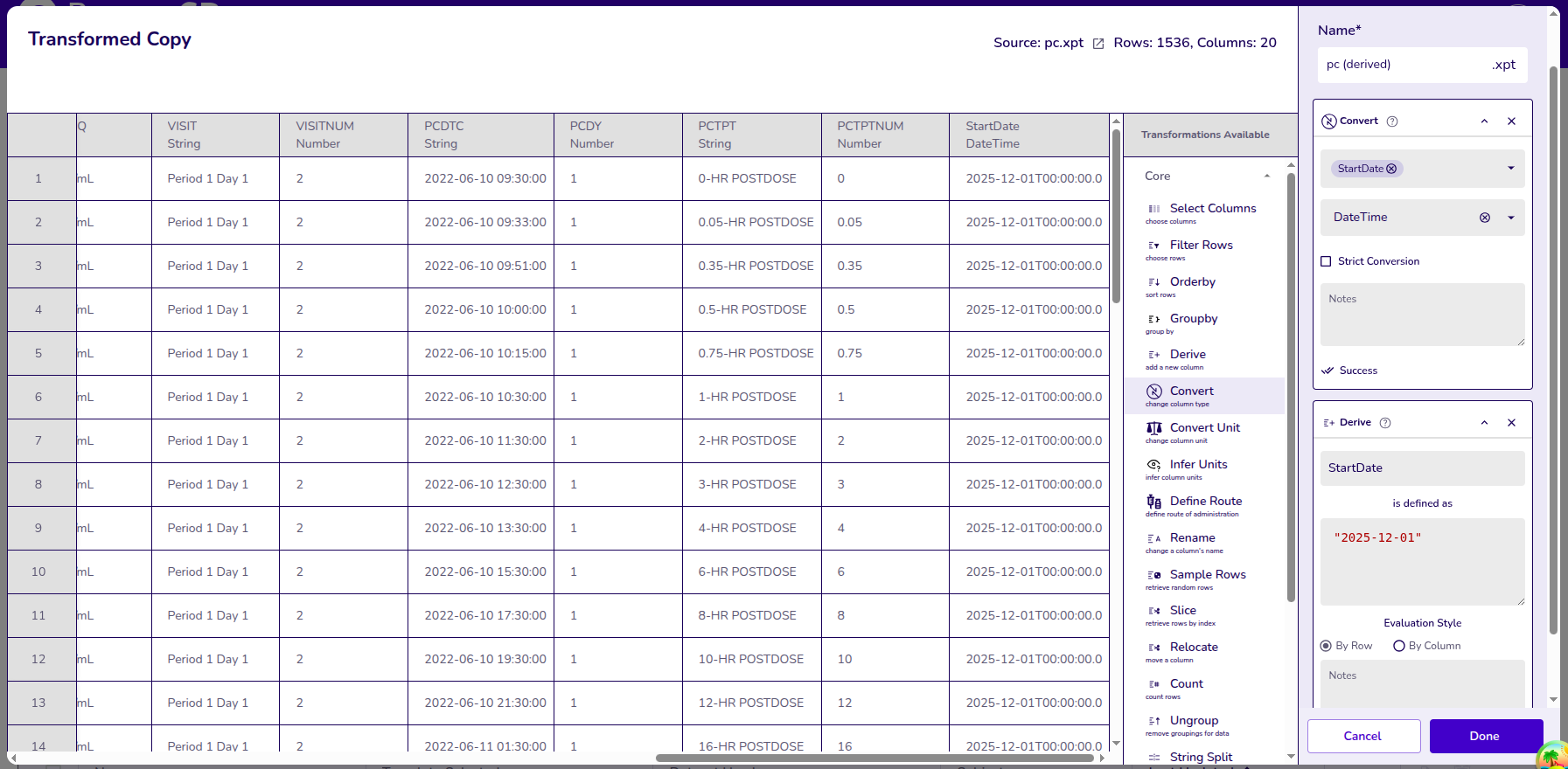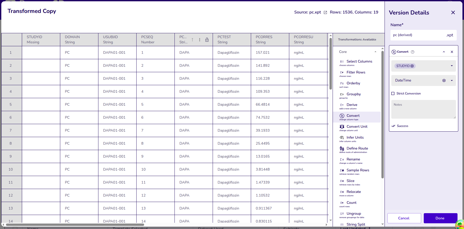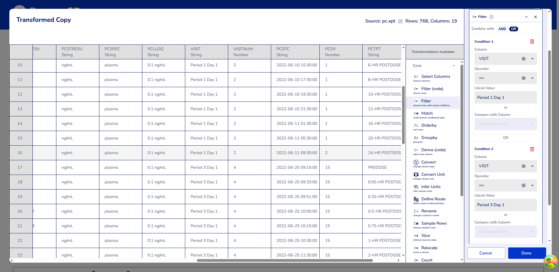 Example: Selecting columns PCDTC (Sample collection Time), PCSTRESN (Standard result numeric) , and USUBJID (Unique Subject ID).
