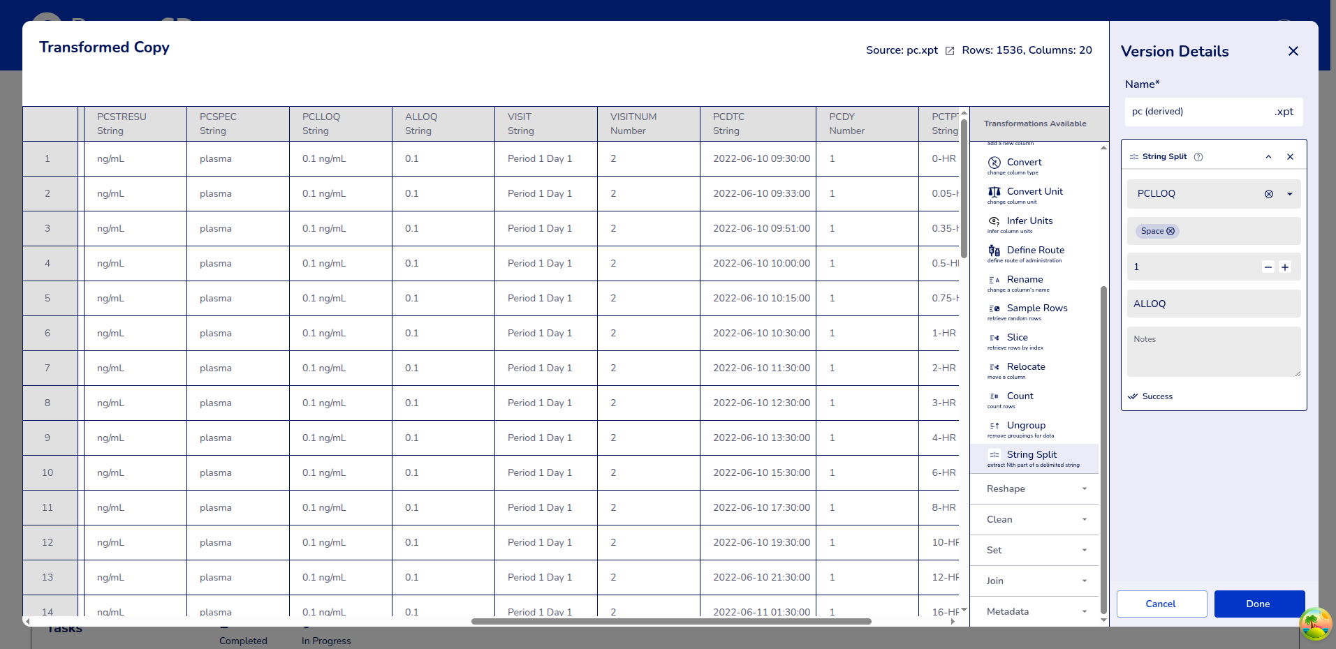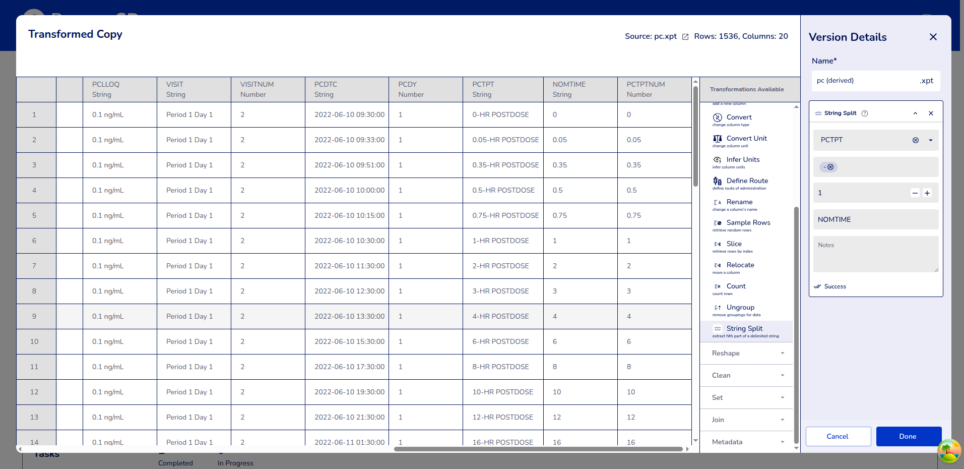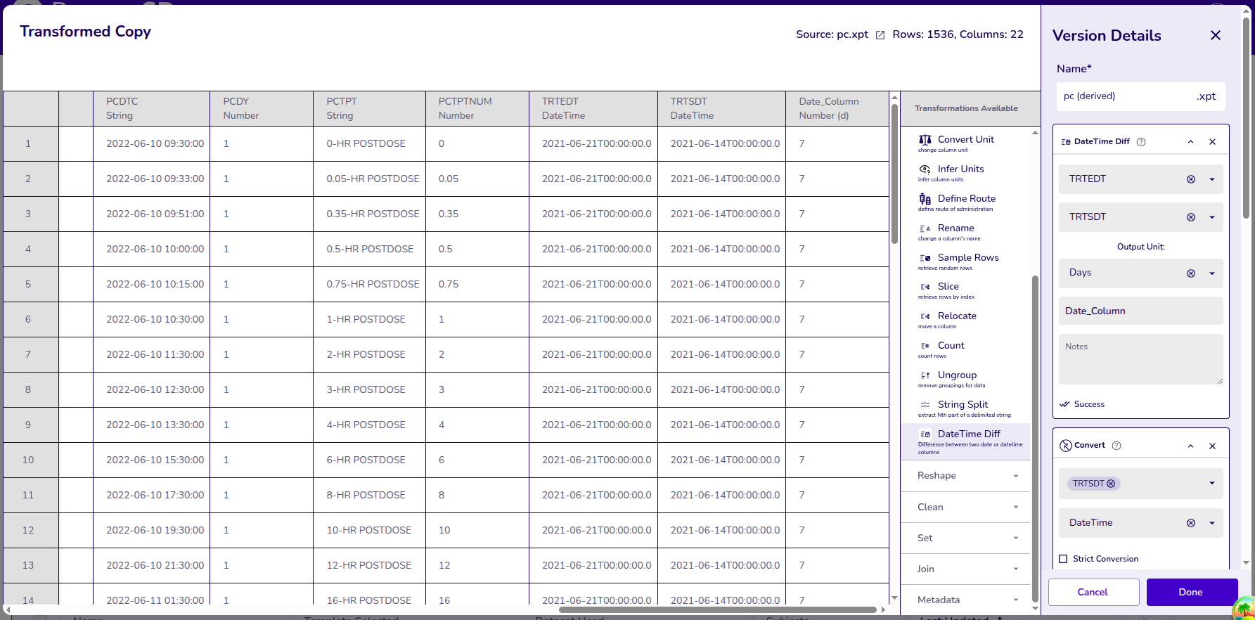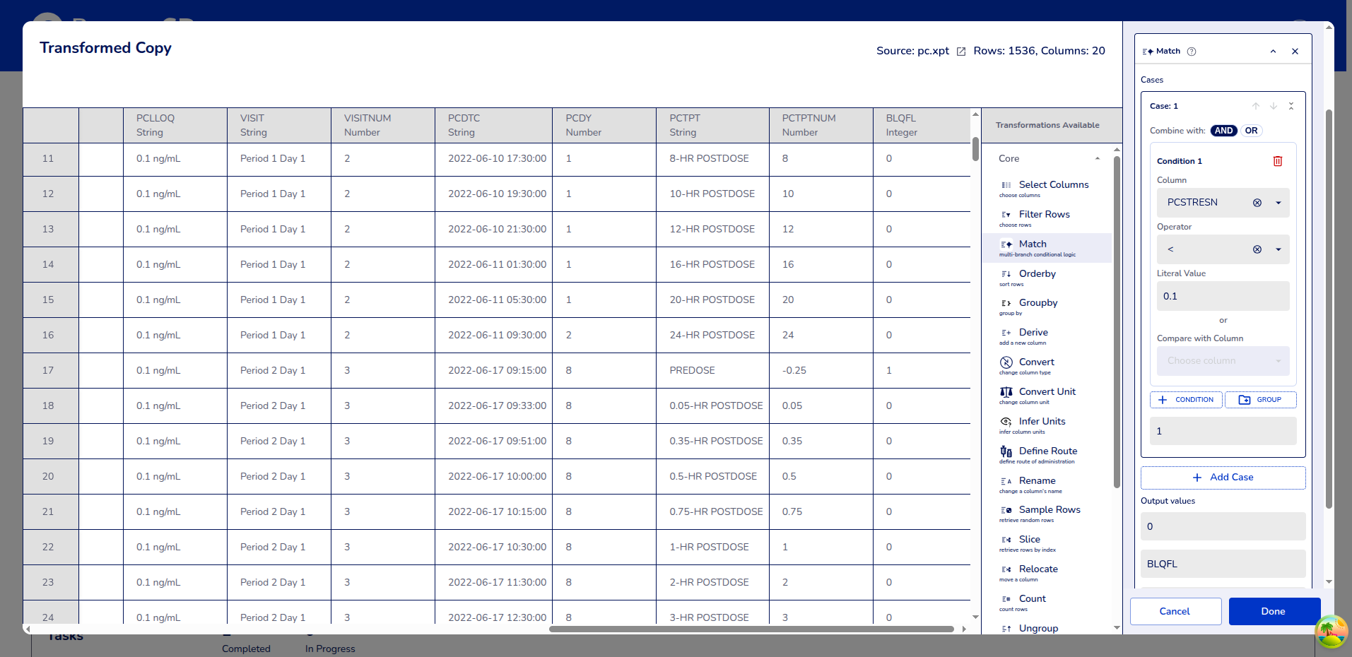 Example: Selecting columns PCDTC (Sample collection Time), PCSTRESN (Standard result numeric) , and USUBJID (Unique Subject ID).