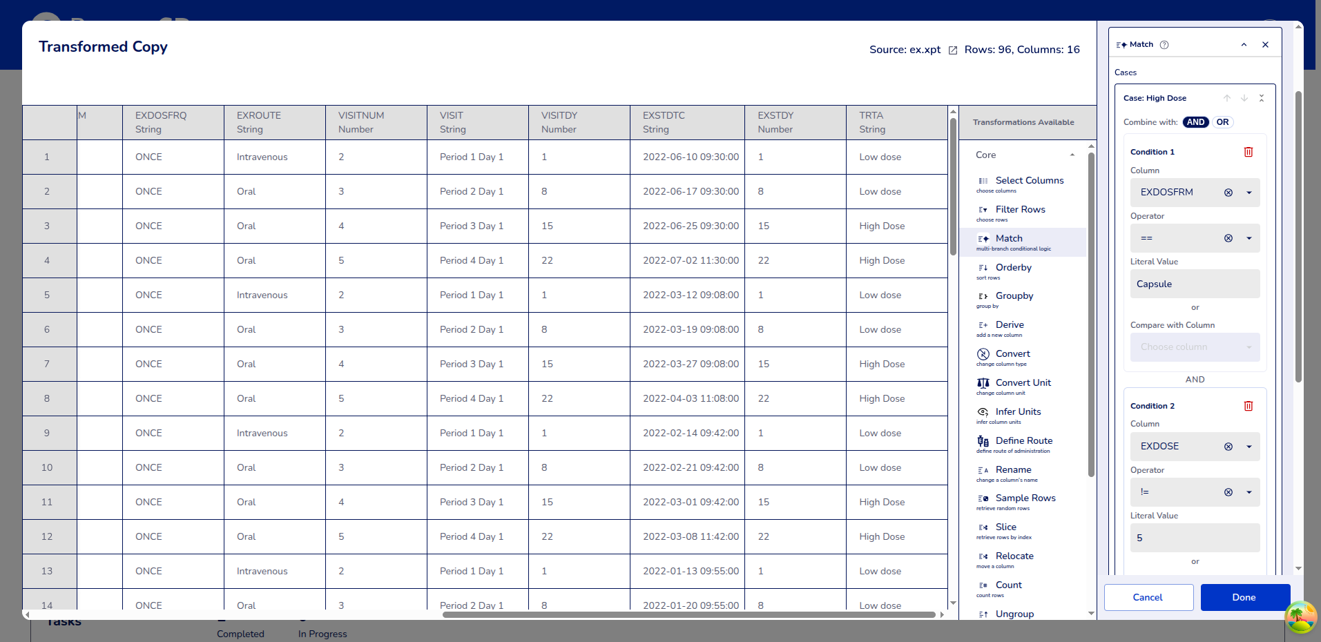 Result: TRTA = "High Dose" for capsules with dose ≠ 5, "Low dose" otherwise