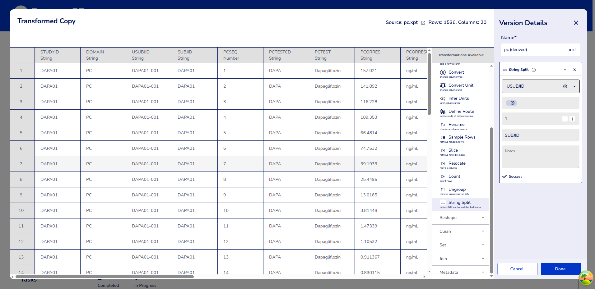 Example 2: Split "DAPA01-001" into Study and Subject