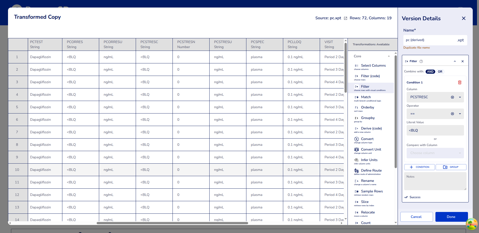 Example 1: Filtering rows where PCSTRESN (Concentration) is less than 0.1. This is written as :PCSTRESN <= 0.1 in the filter box.